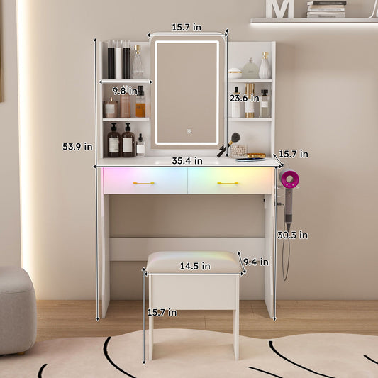 Vanity Desk With LED Lights Mirror, Power Outlet, Storage Drawers & Chair - White