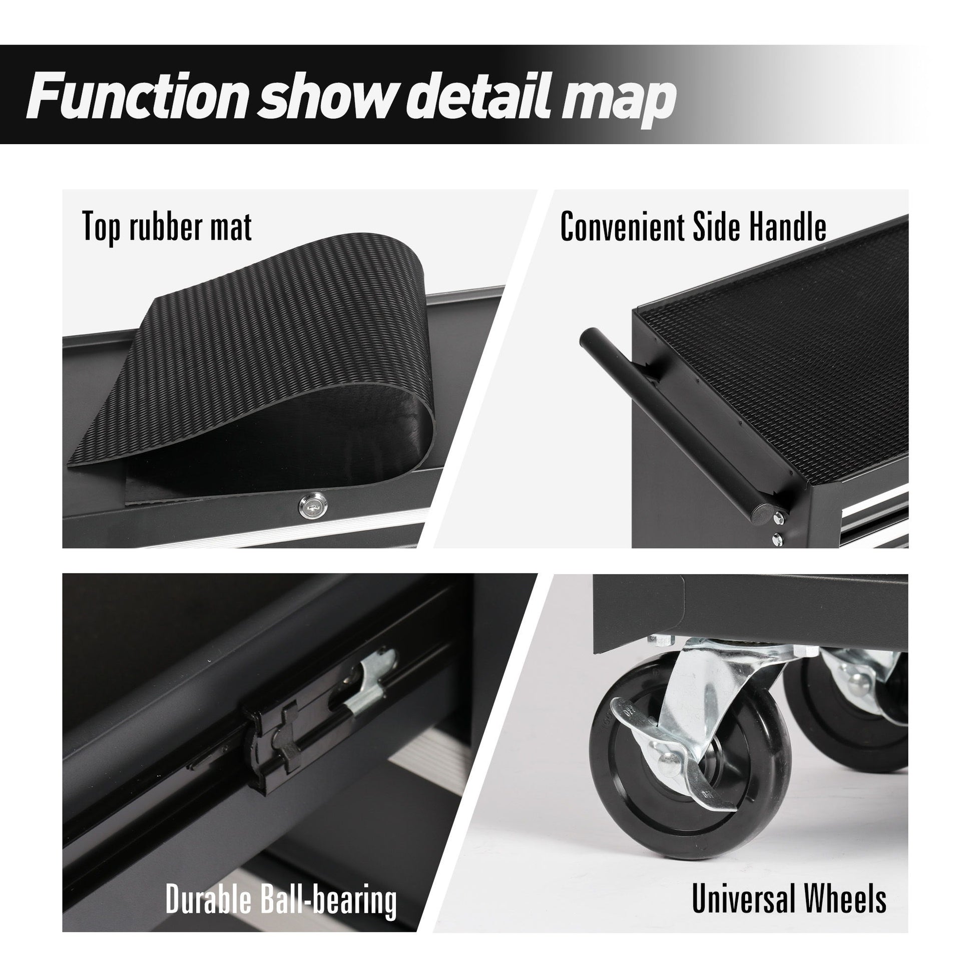 - Smooth Mobility: 4 swivel wheels (2 lockable) enable 360° maneuverability with parking stability, while ball-bearing slides ensure quiet, secure tool storage during movement.