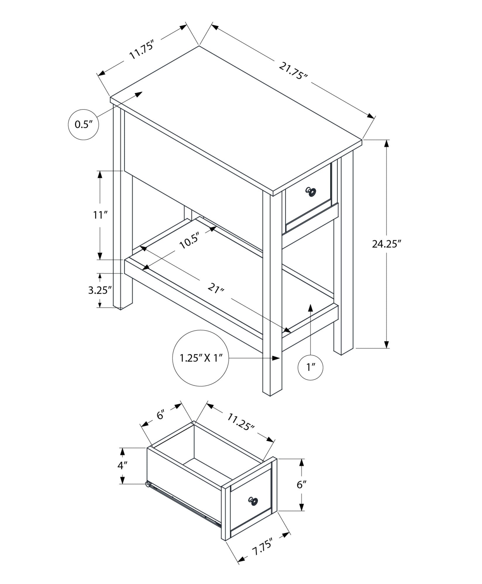 - Convenient Storage: Includes a storage drawer on smooth metal glides with a metal knob, ideal for keeping small essentials tucked away, along with a spacious bottom shelf for additional organization.