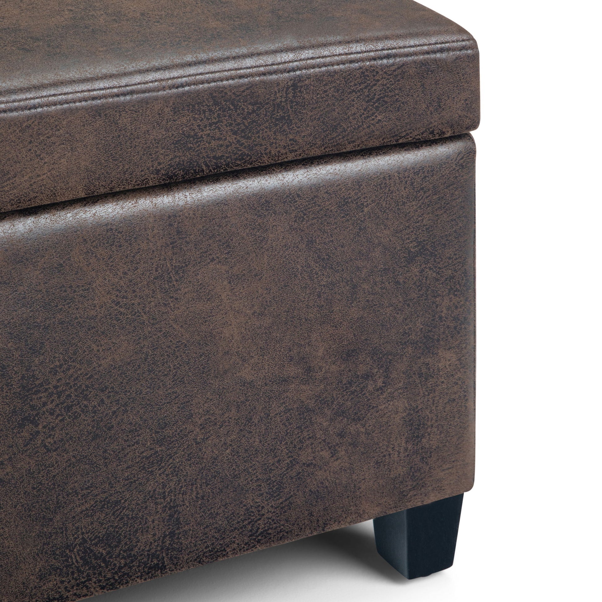 - Upholstered with a durable Distressed Brown Vegan Faux Leather