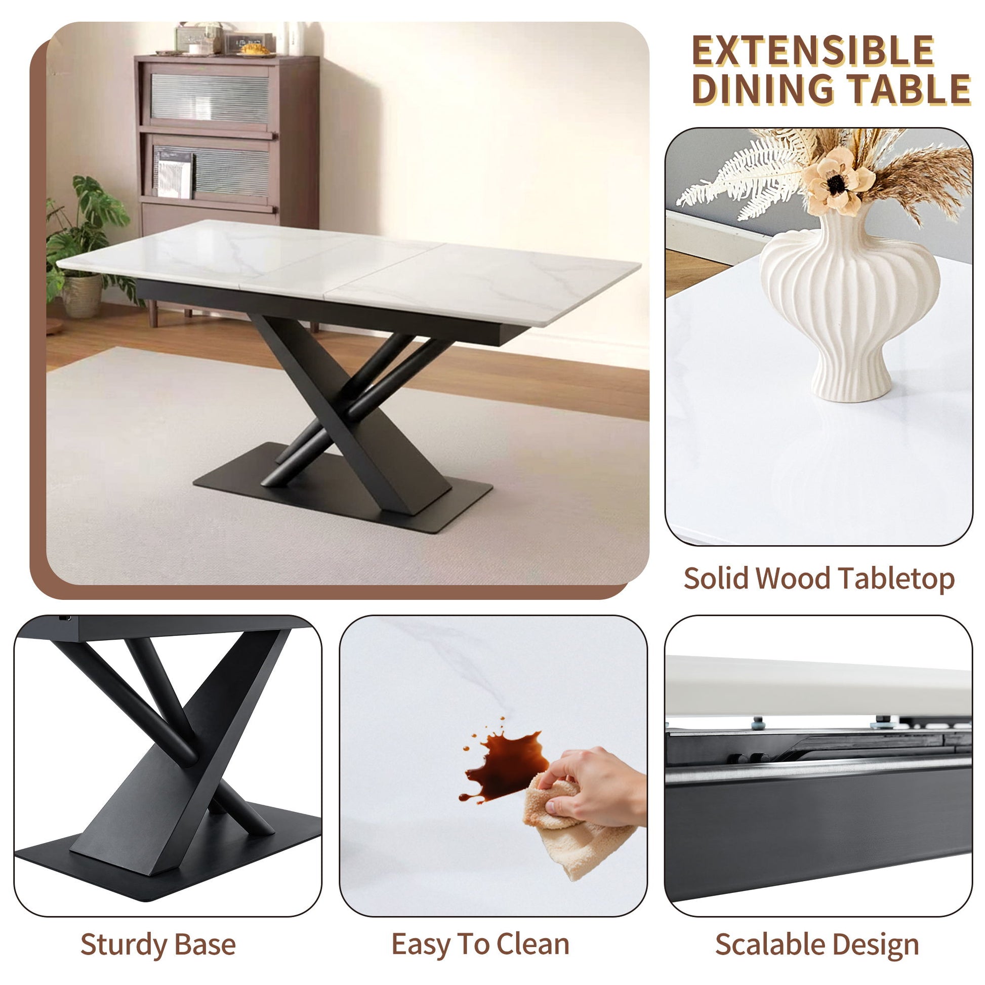 - [Easy to Maintain & Long-Lasting] The spray-painted MDF surface resists stains and fading, and stays clean with a simple wipe. Paired with durable metal construction, this extendable dining table provides long-lasting style and reliable use for years.