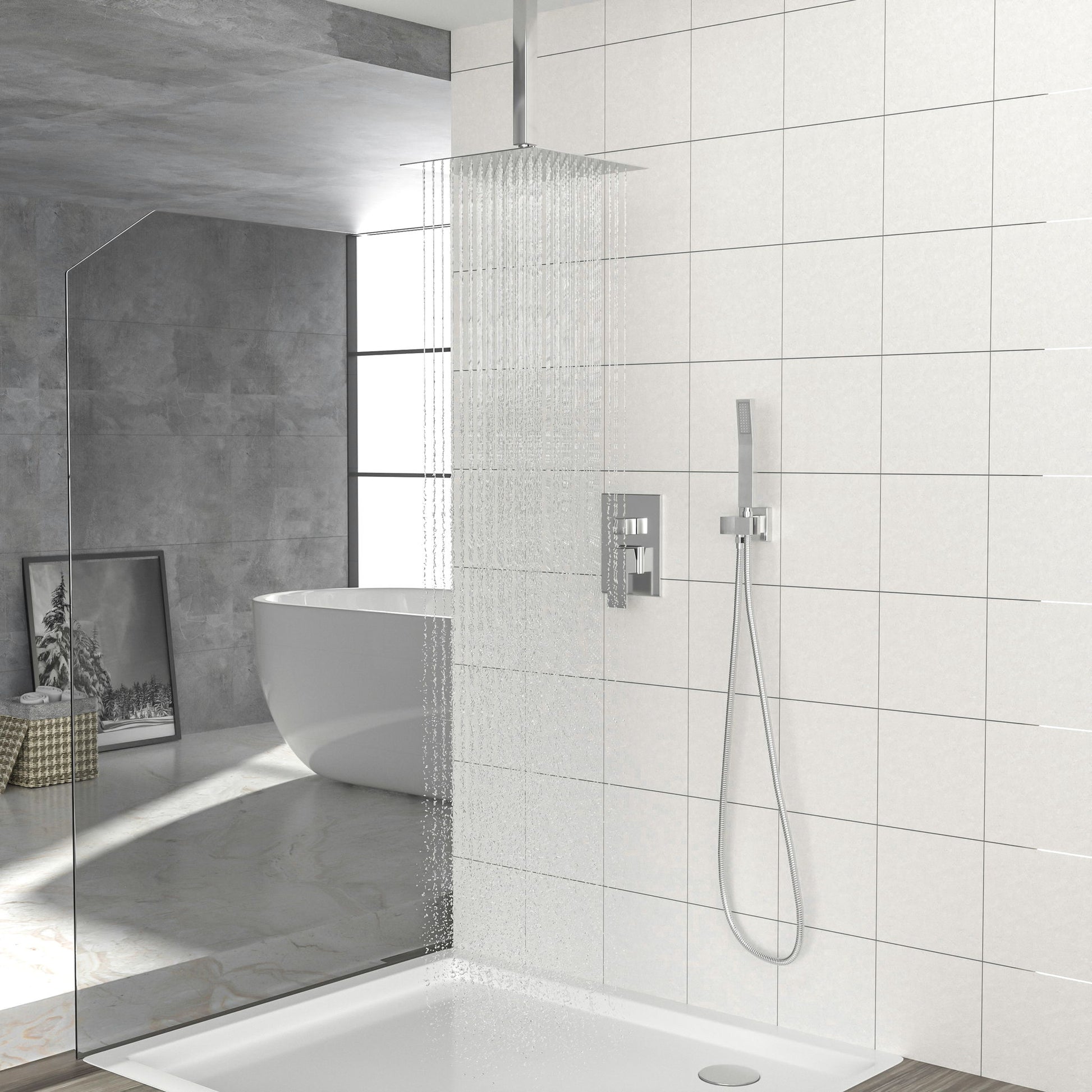 Dual Shower Head Ceiling Mount Square Rain Shower System With Adjustable Flow