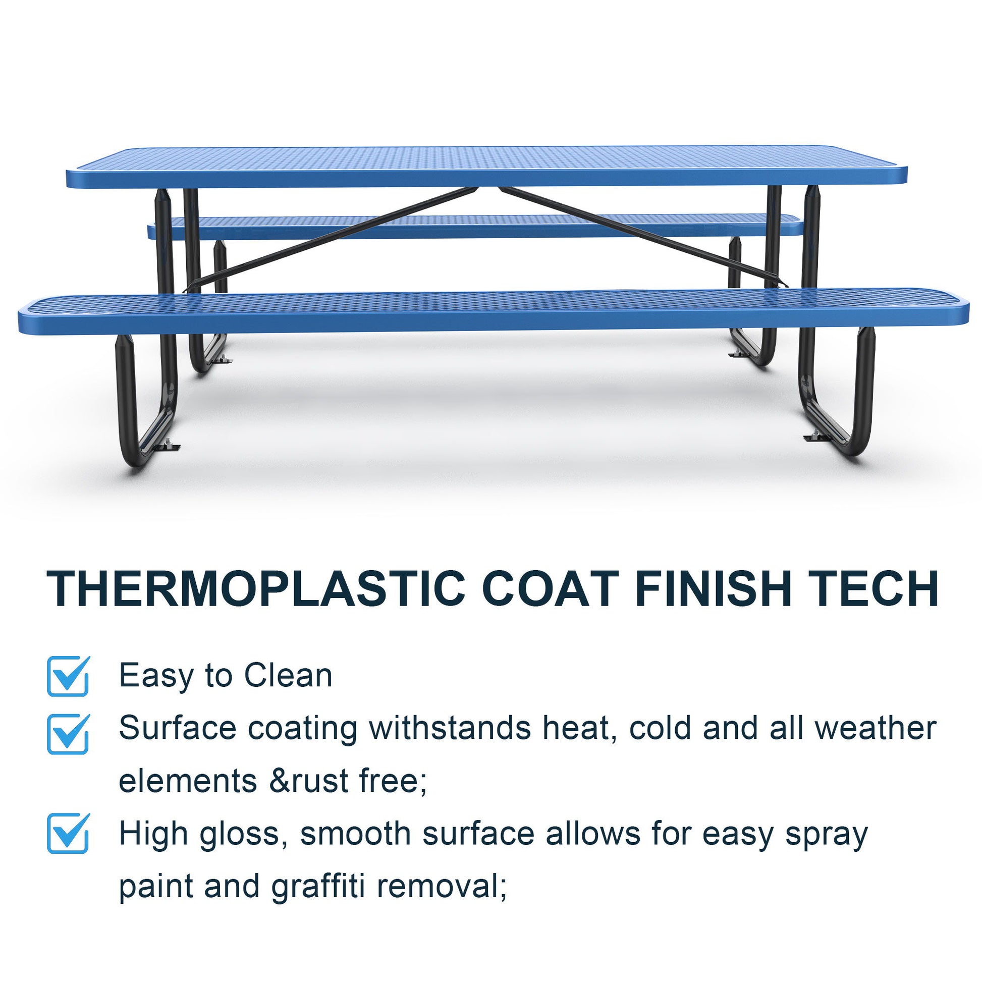- Durable Construction: Made with industrial-strength steel and a thermoplastic coating, the square table and chair tops are built to last. The bench legs feature galvanized frames with a heavy-duty powder coat finish, ensuring resilience against harsh weather.