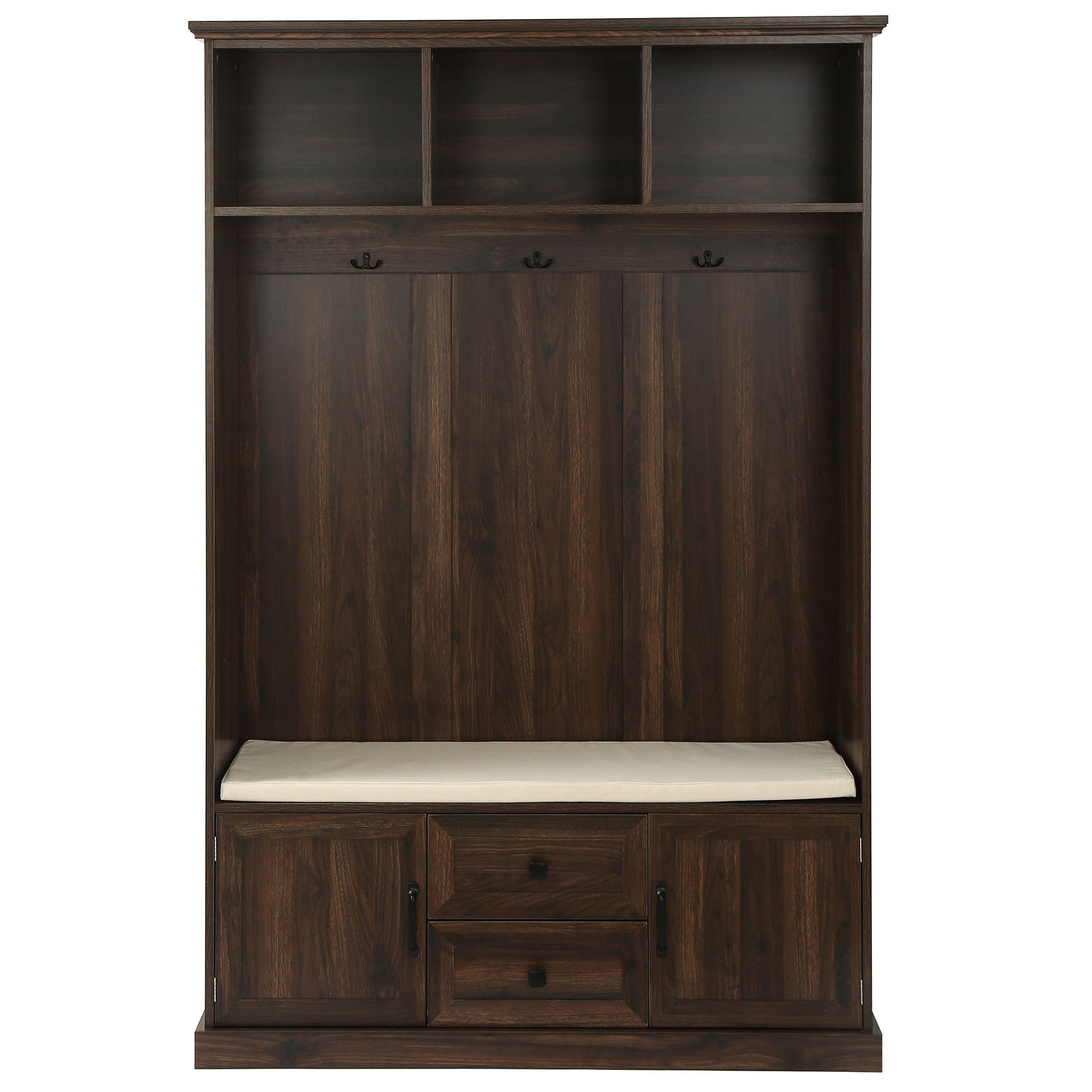 - Ample Storage Space: Featuring three open storage shelves, three metal double hooks, a shoe bench, and additional shoe storage at the bottom, this hall tree maximizes storage and helps maintain a clutter-free home.