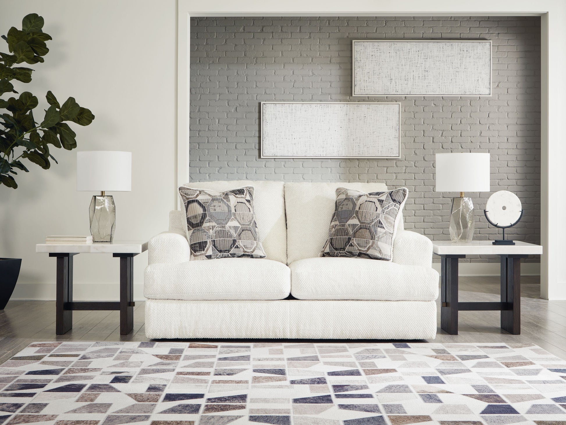 Craving casual refinement? This loveseat has you covered. Its decidedly contemporary frame cradles sizable cushions in an ultra-soft neutral hue, lightening the mood in your living room with simple style and everyday comfort. Solid and geometric accent pillows perfect the chic-meets-cozy vibe.