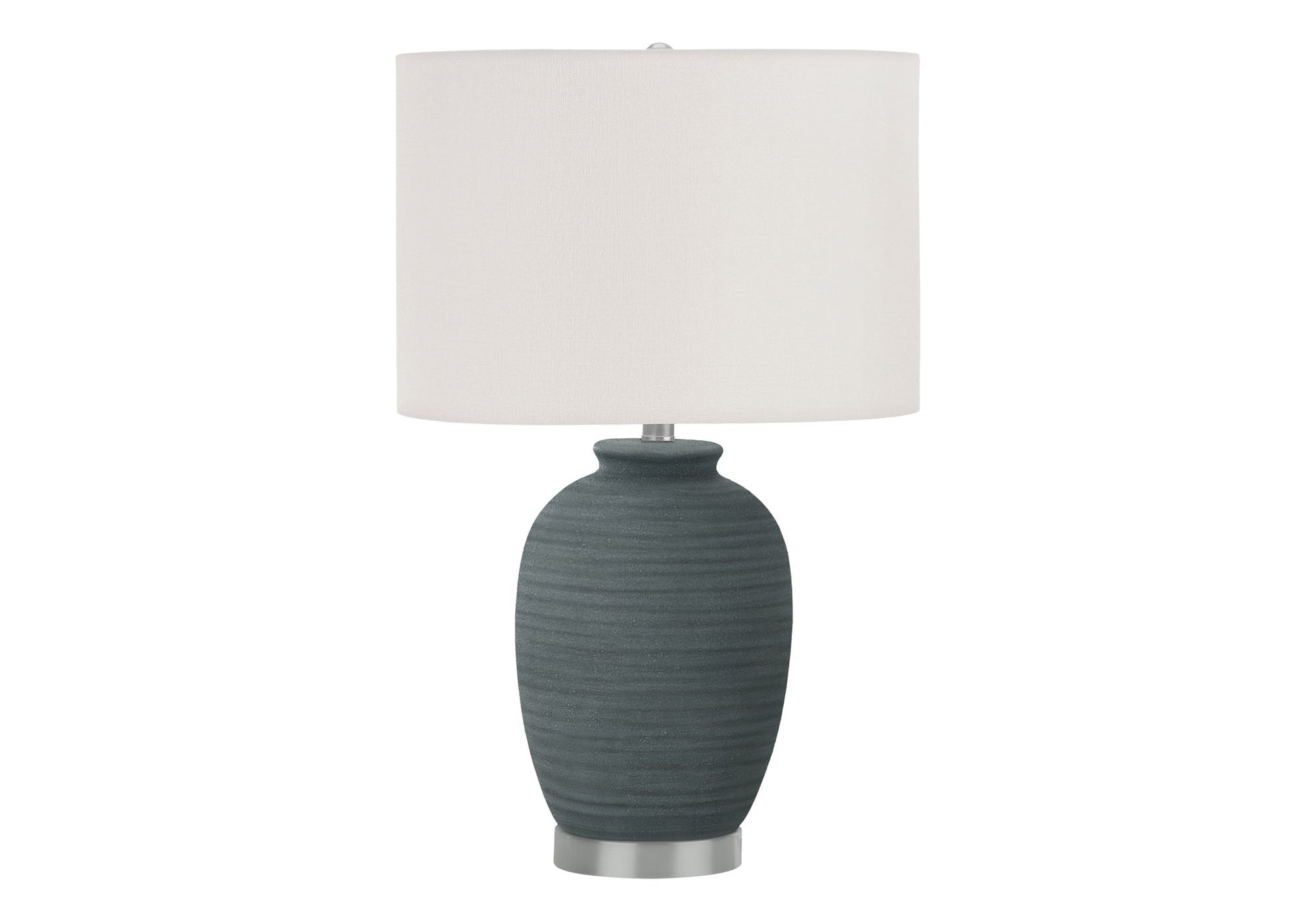 - Stylish Design: This table lamp features a textured blue ceramic base with a sleek silver metal footing, complemented by a drum-shaped ivory fabric shade and a round silver finial on top, offering a modern and elegant look.