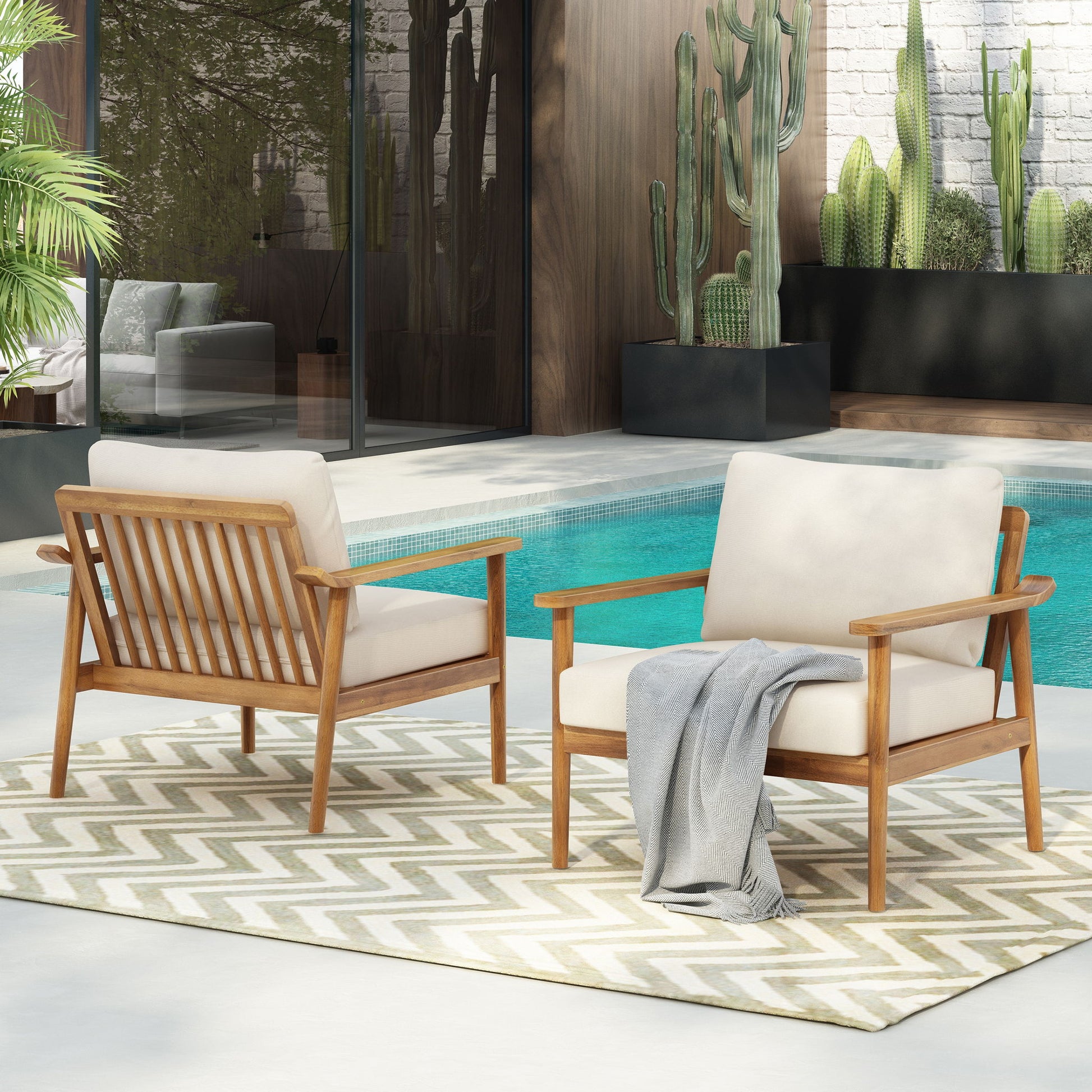 Mid Century Modern Outdoor Lounge Chair Set With Cushions Wood Frame For Patio, Garden, Or Balcony - Teak