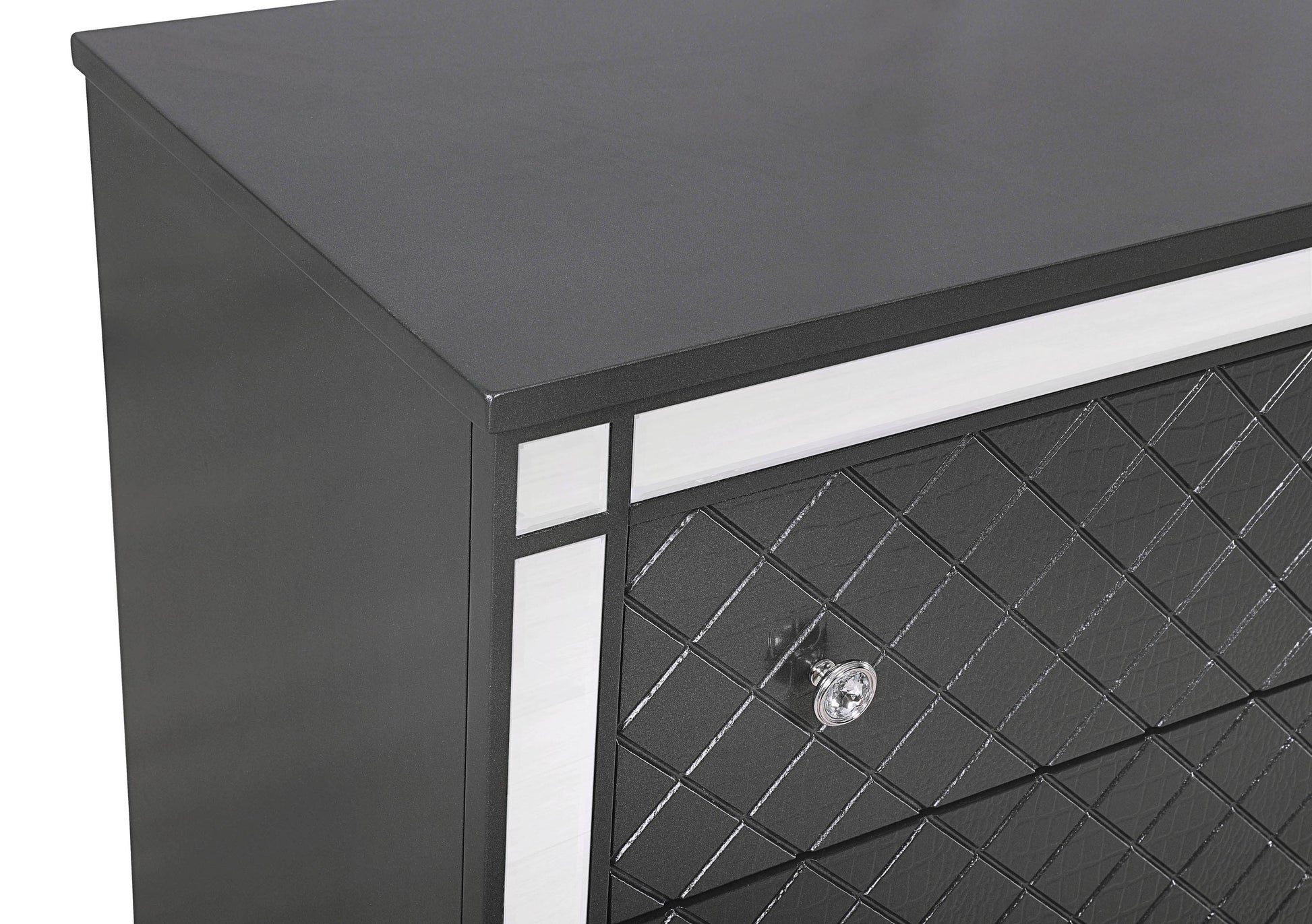 Elevate your sanctuary with this dazzling bedroom collection, where contemporary chic meets timeless charm. The suite boasts a stunning graphite finish, imbuing your space with an air of sophistication and modern luxury. At the heart lies a plush, tufted bed that invites you to indulge in comfort, highlighted by integrated LED lighting. Ample storage solutions are provided through sleek, lined dressers and nightstands, where functionality meets finesse.