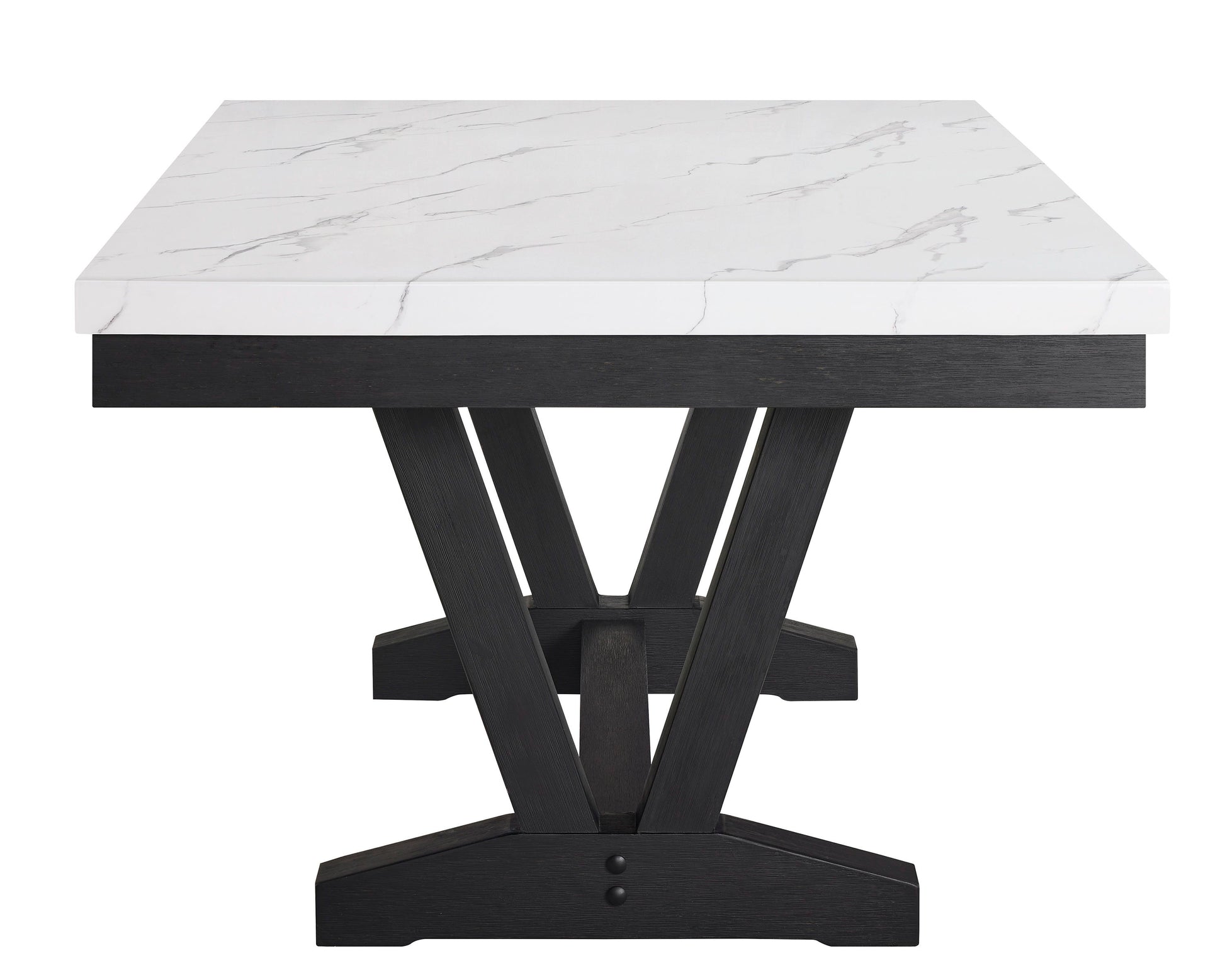 A fresh take on a traditional silhouette makes this group a great addition to your dining space. A faux marble top provides an elegant look while being easy to care for. The trestle base is updated in a contemporary charcoal finish. The upholstered dining chairs feature gently sloped wings and a nail head trim on the back. Button tufting accents the dining bench.